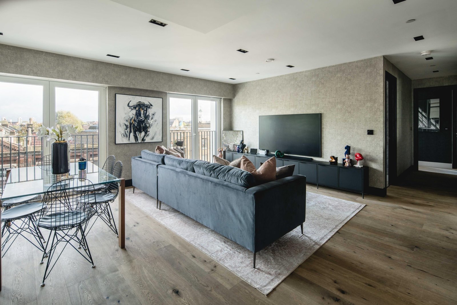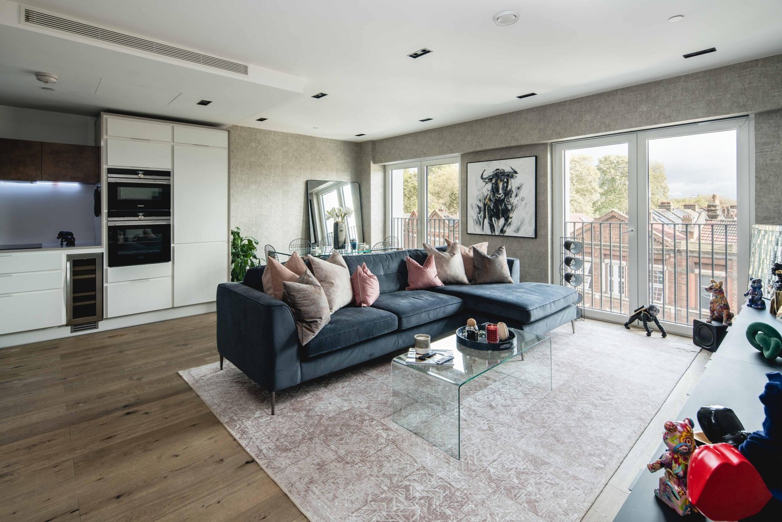 The property features a spacious open-plan living and dining area, ideal for relaxing or entertaining, with large windows that fill the space with natural light. The contemporary kitchen is fully equipped with integrated appliances, including a fridge/freezer, oven, and dishwasher, making it perfect for everyday cooking and hosting guests.