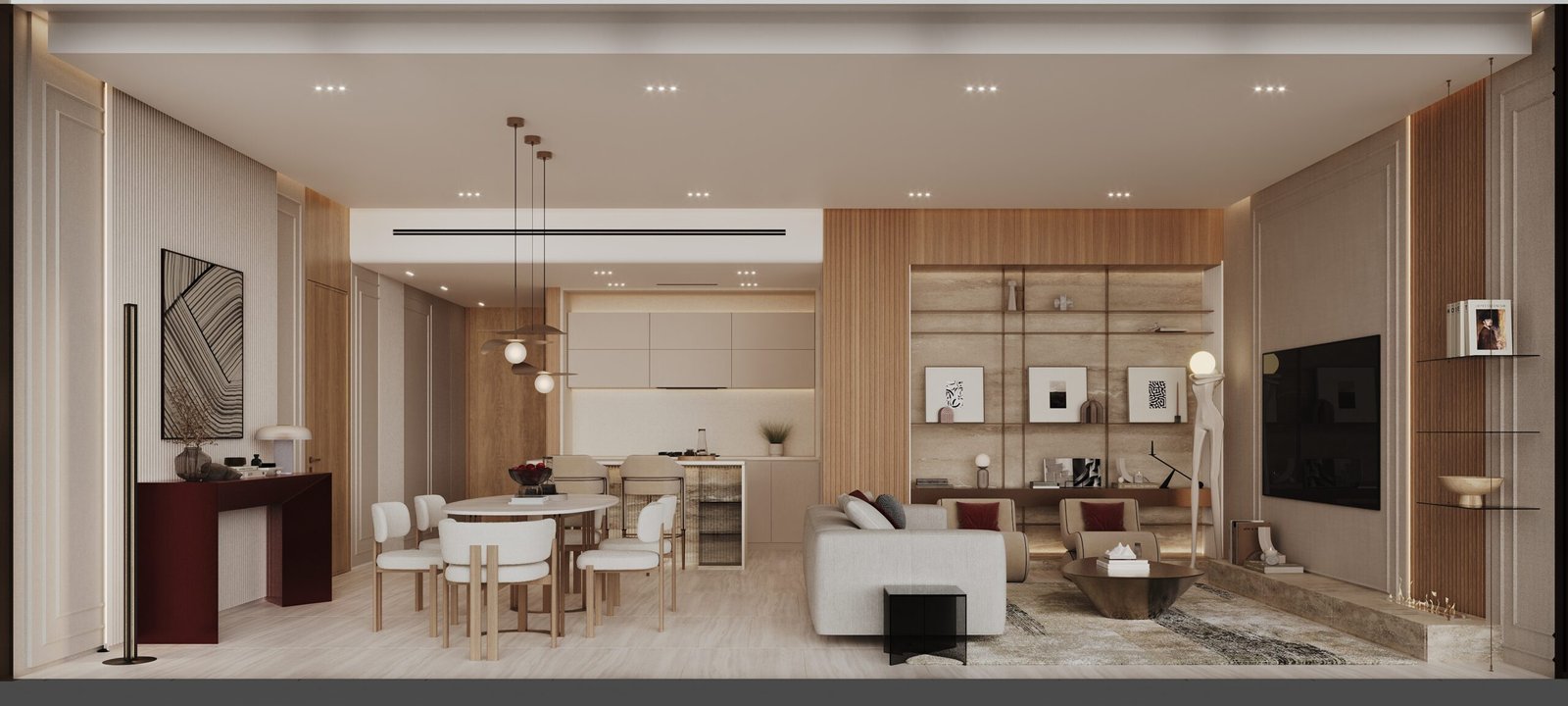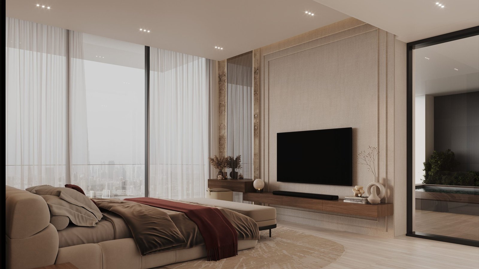The apartment features a spacious bedroom that boasts ample storage space, creating an ideal retreat. Large windows allow natural light to fill the space, providing a bright and airy atmosphere. The open-plan kitchen is a standout feature, equipped with high-quality cabinetry, countertops, and state-of-the-art appliances, making it both a functional cooking space and a stylish centerpiece of the home. The design of the apartment is minimalist and contemporary, with clean lines and luxurious finishes that enhance the overall ambiance. The bathroom is elegantly designed with sleek, modern fixtures and a spa-like feel, offering a perfect spot to unwind after a long day. Throughout the apartment, the high-quality finishes reflect the attention to detail that Binghatti Ruby is known for.